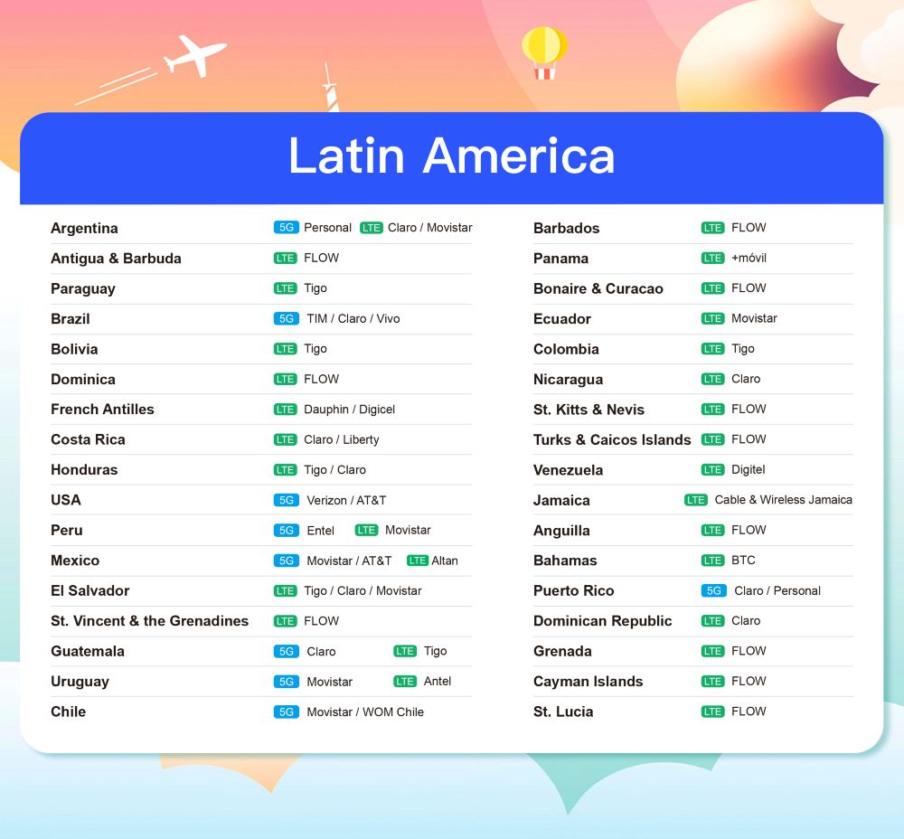 อาร์เจนตินา, แองกวิลลา, แอนติกาและบาร์บูดา, บาร์เบโดส, บาฮามาส, ปานามา, บราซิล, เปอร์โตริโก, โบลิเวีย, โบแนร์และคูราเซา, สาธารณรัฐโดมินิกัน, โดมินิกา, เอกวาดอร์, เฟรนช์แอนทิลลิส, โคลอมเบีย, คอสตาริกา, เกรนาดา, ฮอนดูรัส, หมู่เกาะเคย์แมน, สหรัฐอเมริกา, มอนต์เซอร์รัต, เปรู, เม็กซิโก, นิการากัว, เอลซัลวาดอร์, หมู่เกาะเติกส์และเคคอส, เวเนซุเอลา, อุรุกวัย, จาไมก้า, ชิลี