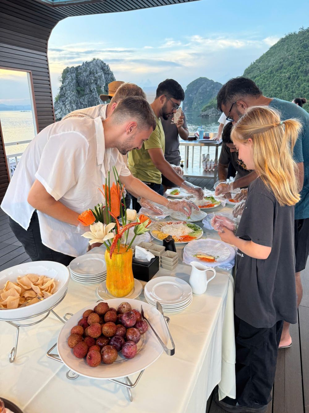 ▲ คลาสทำอาหารบนเรือ Arcady Boutique Cruise เชิญผู้เดินทางมาเรียนรู้วิธีการเตรียมอาหารสัญชาติเวียดนามแบบดั้งเดิม โดยมีเชฟบนเรือคอยให้คำแนะนำ เป็นประสบการณ์ที่สนุกสนานและได้ลงมือทำจริง ซึ่งผสมผสานการค้นพบทางวัฒนธรรมเข้ากับรสชาติที่อร่อย