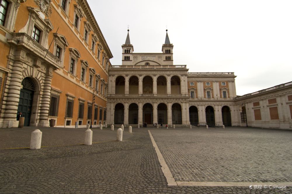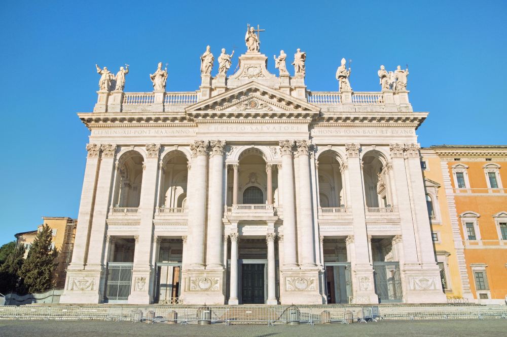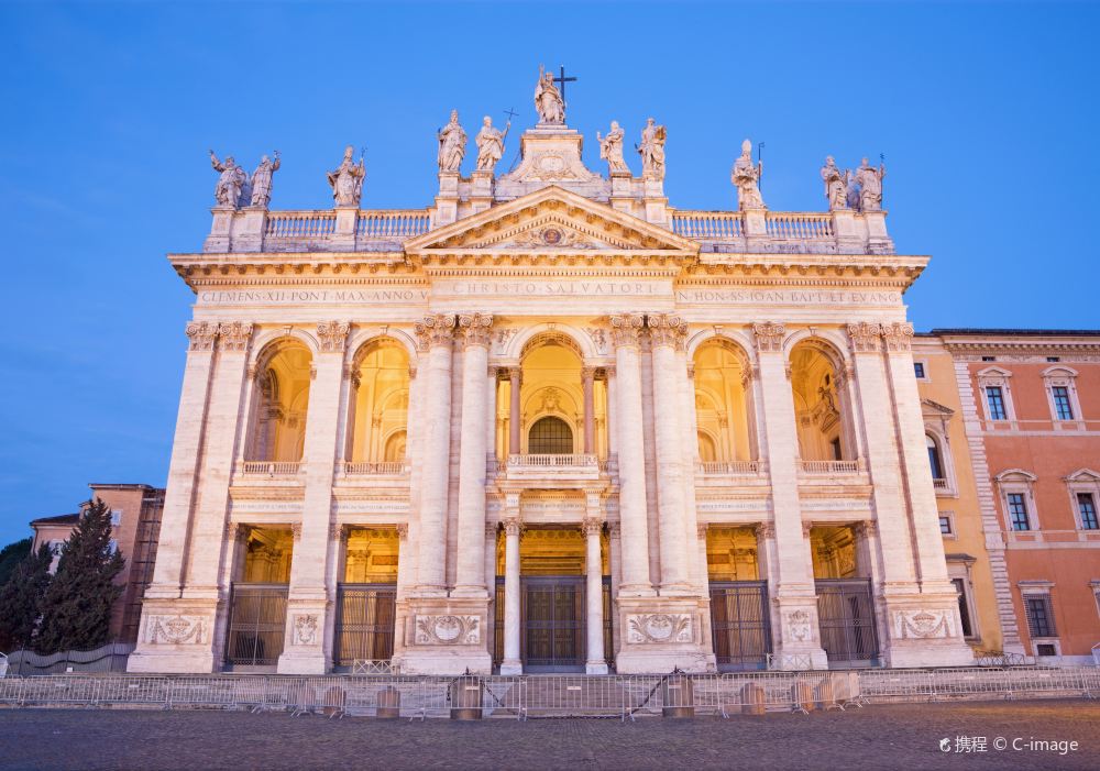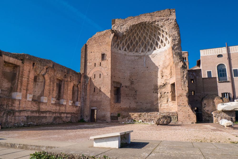 ▲ ภาพยามเย็นที่ส่องสว่างด้วยแสงไฟ มีรั้วล้อมรอบ พร้อมกับสนามหญ้าและต้นไม้ที่อยู่ข้างเคียง แสดงให้เห็นถึงความยิ่งใหญ่ของสถาปัตยกรรมโบราณของโรม