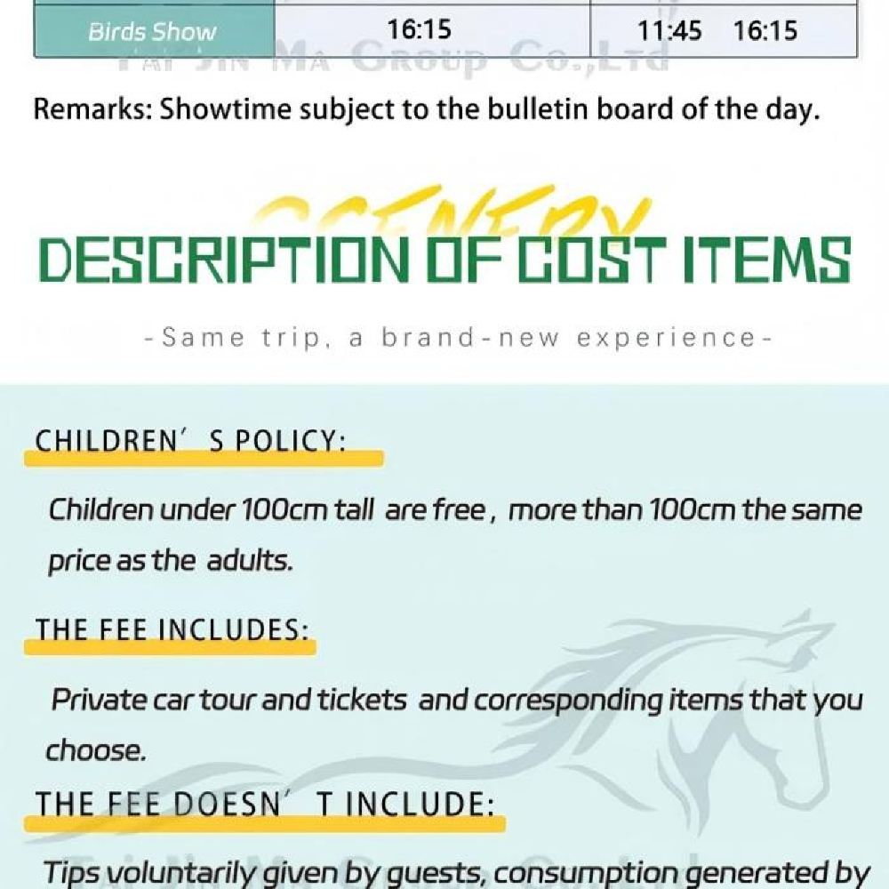 ประมาณเวลา 15:00 น.: ไปยังเขตสวนสัตว์ นั่งรถส่วนตัวเยี่ยมชมสวนสัตว์แบบเปิดโล่ง (ห้ามเปิดหน้าต่างหรือลงจากรถตลอดระยะทางทั้งหมด)