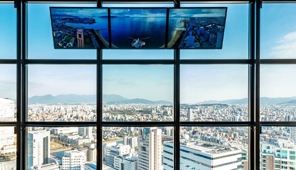 ▲ [ฟุกุโอกะทาวเวอร์] ตัวตึกเป็นสถาปัตยกรรมสมัยใหม่ที่ประดับด้วยกระจกสะท้อนแสง 8,000 แผ่น และเป็นที่รู้จักในชื่อเล่นว่า "เรือใบกระจก" ที่มีใบเรือสะท้อนแสงแวววาว ผ่านหน้าต่างบานใหญ่แบบพาโนรามา 360 องศาที่ความสูง 123 เมตรในห้องชมวิว คุณสามารถชมทิวทัศน์อันสวยงามของเมืองฟุกุโอกะและอ่าวฮากาตะได้อย่างเต็มตา
