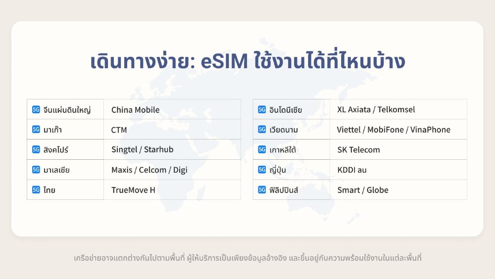 • สำหรับแพ็กเกจหลายประเทศ โปรดติดตั้งและเปิดใช้งาน eSIM เมื่อคุณพร้อมใช้งานที่ปลายทางเท่านั้น การเชื่อมต่อกับเครือข่ายที่รองรับภายในพื้นที่ให้บริการอาจทำให้แพ็กเกจเริ่มใช้งานเร็วกว่าที่คาดไว้