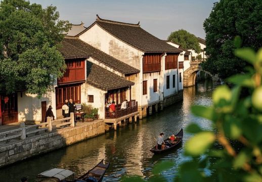 ▲ซุ้มประตูโค้งทั้งห้าสะท้อนบนผิวน้ำ โดยมีสะพานโบราณที่ใหญ่ที่สุดของเซี่ยงไฮ้ทอดขวางคลองโบราณอายุพันปีดุจดั่งจันทร์เพ็ญ