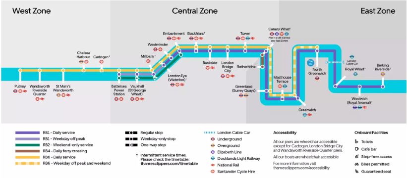 - ท่าเรือทั้งหมดสามารถเข้าถึงได้โดยไม่มีอุปสรรค ยกเว้นท่าเรือ Cadogan, Wandsworth Riverside Quarter และ London Bridge City