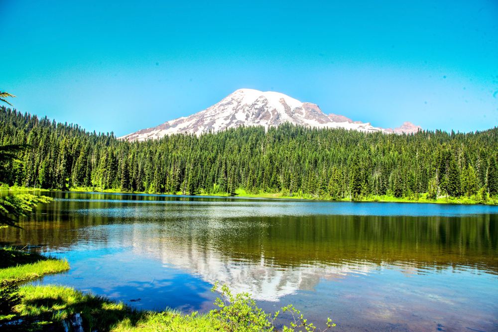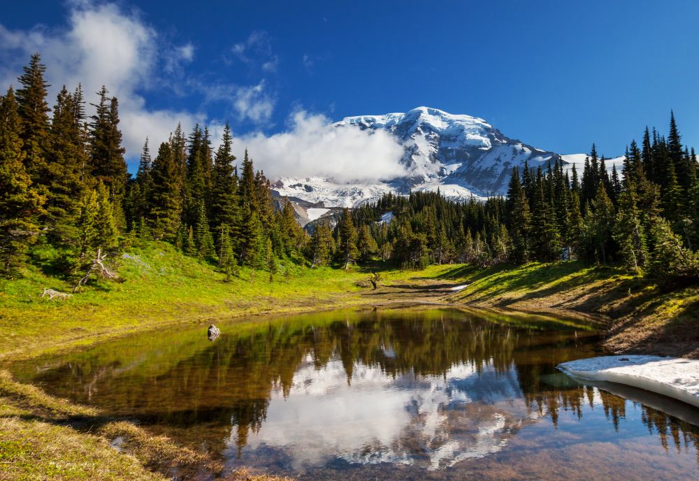 ภูเขาเรเนียร์เป็นสัญลักษณ์สำคัญของภูมิประเทศในรัฐวอชิงตัน ภูเขาเรเนียร์หรือที่รู้จักในชื่อทาโคมา เป็นยอดเขาที่สูงที่สุดในเทือกเขาแคสเคดทางตะวันตกเฉียงเหนือของแปซิฟิก และเป็นภูเขาที่สูงที่สุดในรัฐวอชิงตัน ภูเขาเรเนียร์เป็นภูเขาไฟที่ยังคุกรุ่นและมียอดเขาที่ปกคลุมด้วยธารน้ำแข็งมากที่สุดในสหรัฐอเมริกา โดยเป็นต้นกำเนิดของแม่น้ำสำคัญ 5 สาย ส่วนยอดเขานั้นถูกปกคลุมด้วยหิมะตลอดทั้งปี เมื่อหิมะละลาย น้ำจะไหลลงมาในปริมาณมาก สร้างน้ำตกที่สวยงามที่สุดในอุทยานแห่งชาติเรเนียร์ พร้อมทั้งทะเลสาบกว้างใหญ่และป่าไม้ที่เขียวชอุ่ม