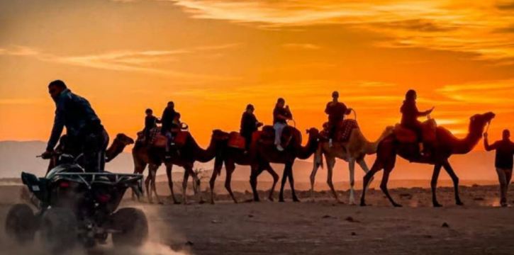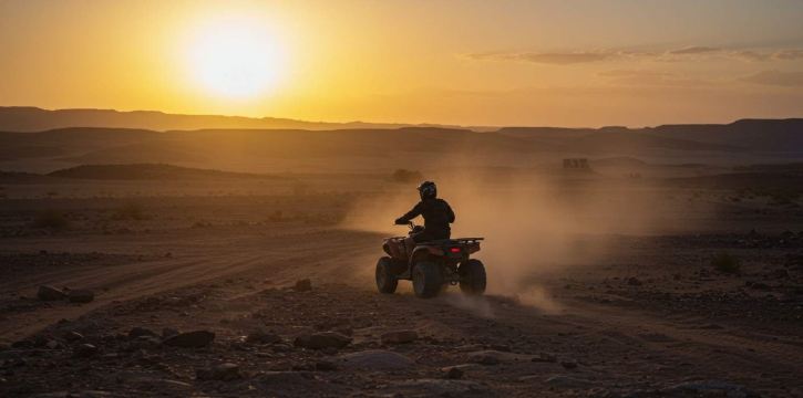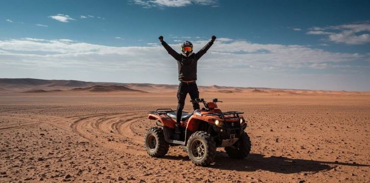เริ่มต้นการผจญภัยสุดตื่นเต้นกับรถ ATV ในทะเลทรายอากาไต (Agatay Desert) พิชิตเนินทรายและชมทิวทัศน์อันน่าหลงใหล หลังจากนั้นเพลิดเพลินกับอาหารเย็นแบบดั้งเดิมของโมร็อกโกในความสะดวกสบายของเต็นท์เร่ร่อน ก่อนอื่นเราจะไปรับคุณที่ที่พักในมาร์ราเกช จากนั้นนั่งรถบัสไปยังจุดเริ่มต้นของการผจญภัยด้วยรถ ATV เมื่อถึงที่หมาย ไกด์นำเที่ยวจะให้คำแนะนำอย่างละเอียดเกี่ยวกับวิธีการขับขี่รถ ATV และแผนการเดินทางในวันนั้น ก่อนออกเดินทาง คุณจะมีเวลาในการฝึกซ้อมในพื้นที่กว้างขวาง ตามไกด์นำเที่ยวเข้าไปในทะเลทราย ขับรถ ATV พิชิตเนินทรายกับฉากหลังอันงดงามของเทือกเขาอัตแลส หยุดที่จุดต่างๆ เพื่อถ่ายภาพธรรมชาติที่สวยงามรอบตัวและเก็บความประทับใจที่ยากจะลืมเลือน