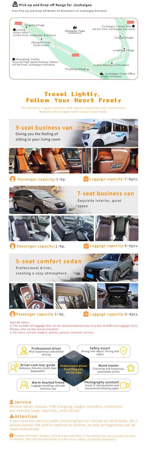 บริการรับ-ส่งฟรีที่โรงแรมใกล้ทางเข้าจิ่วไจ้โกว | เช่าเหมาลำสะดวกยิ่งขึ้น | ส่วนตัวยิ่งขึ้น กำหนดการเดินทาง: 1. จิ่วไจ้โกว - พื้นที่ชมวิวหวงหลง - สถานีรถไฟความเร็วสูง (สถานีหวงหลงจิ่วไจ้โกวและสถานีซ่งผานเป็นทางเลือก) นอกจากนี้ยังมีบริการรับ-ส่งใกล้สถานีรถไฟความเร็วสูง (กรุณาสอบถามรายละเอียด) รถยนต์รุ่นต่างๆ [รถเก๋ง 5 ที่นั่ง, ชั้นธุรกิจ 7 ที่นั่ง, ชั้นธุรกิจหรูหรา 9 ที่นั่ง] ไม่รวมค่าตั๋ว และสามารถฝากสัมภาระไว้บนรถได้ตลอดการเดินทาง