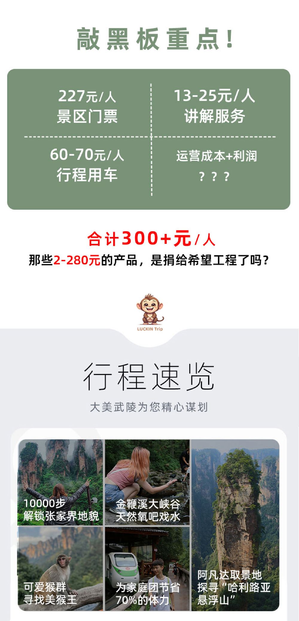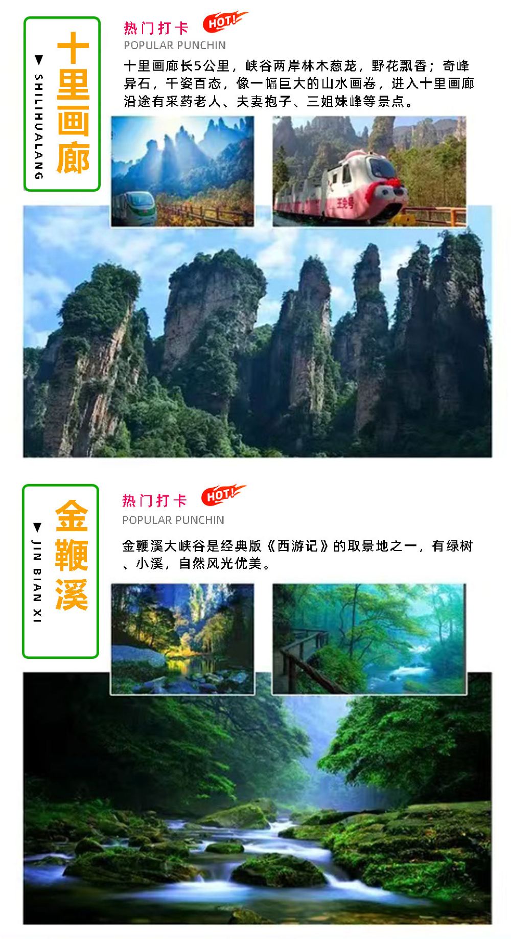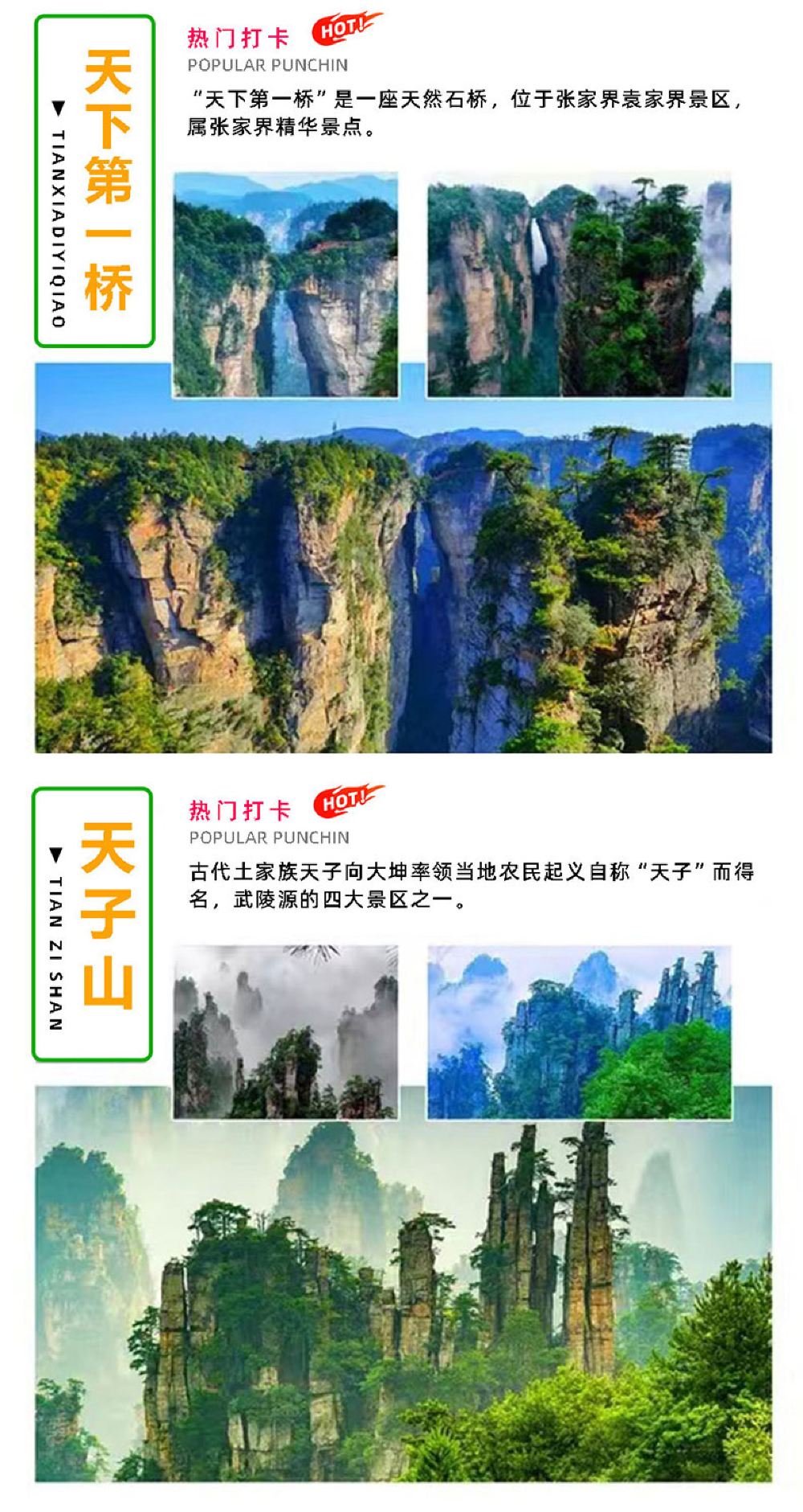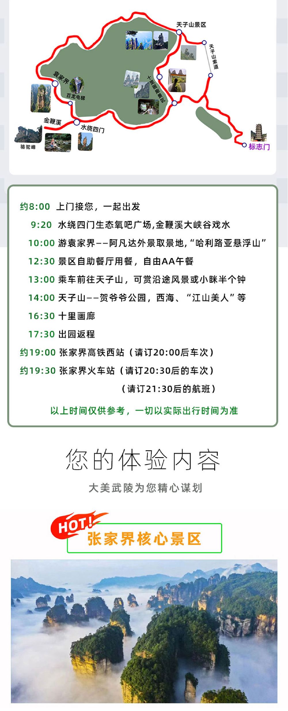 บ่าย : เที่ยวชมสถานที่ต่างๆ[พื้นที่ชมทัศนียภาพภูเขาเทียนจื่อ]สถานที่ท่องเที่ยวสำคัญ ได้แก่: ยอดเขา Yubi, ดอกไม้ Fairy Scattering, สวน Helong, ศาลา Tianzi จากนั้นขึ้นกระเช้าลอยฟ้าภูเขา Tianzi ลงมาจากภูเขา (เสียค่าธรรมเนียมกระเช้าลอยฟ้า เที่ยวเดียว เพิ่ม 72 หยวน/คน) เพื่อชมภาพเขียนทิวทัศน์สถานที่ท่องเที่ยว] ,,นั่งรถไฟเที่ยวชมสถานที่[แกลเลอรี่เท็นไมล์]( ไป-กลับ ตั๋วรถไฟ ท่องเที่ยวไปกลับเพิ่มเติมคนละ 76 หยวน) โดยคุณสามารถเพลิดเพลินไปกับยอดเขา Three Sisters Peak, ยอดเขา Herb Collecting ผู้สูงวัย, ยอดเขา Index Finger Peak และสถานที่ท่องเที่ยวอื่นๆ ระหว่างทาง จากนั้นนั่งรถบัสกลับเมืองและสิ้นสุดการเดินทางของคุณ!