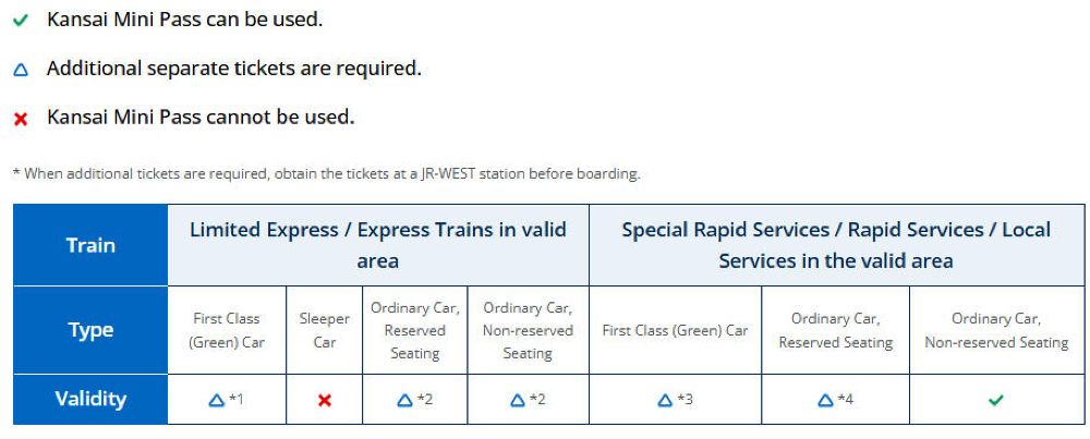 - * รถไฟด่วนคันไซแอร์พอร์ตเอ็กซ์เพรส "ฮารุกะ" และรถไฟด่วนอื่นๆ ต้องซื้อตั๋วรถไฟด่วนแยกต่างหาก