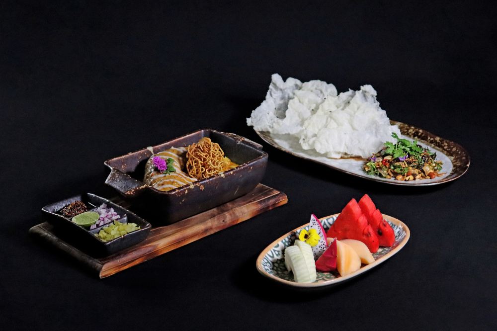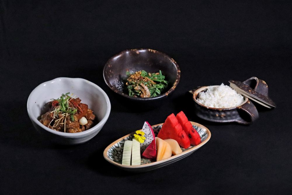 ผัดยอดมะระกอกรอบกุ้งเสียบ (มะระกอกผัดกับกุ้งแห้งกรอบจากพังงา), แกงฮังเล (ขาหมู ไหล่และสามชั้นตุ๋นนานในสมุนไพรและเครื่องเทศสไตล์เหนือ), จานผลไม้ตามฤดูกาล