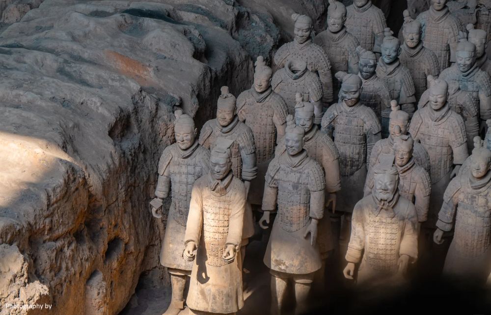 ▲ กองทัพทหารดินเผาที่ค้นพบใกล้เมืองซีอานในปี 1974 เป็นกลุ่มประติมากรรมดินเผาขนาดเท่าตัวจริงที่น่าทึ่ง ซึ่งถูกฝังร่วมกับจักรพรรดิองค์แรกของจีน จิ๋นซีฮ่องเต้ ในช่วง 210–209 ปีก่อนคริสตกาล สร้างขึ้นเพื่อปกป้องจักรพรรดิในชีวิตหลังความตาย กองทัพนี้ประกอบด้วยทหารกว่า 8,000 นาย รถม้า และม้า แต่ละชิ้นมีใบหน้าที่แสดงอารมณ์แตกต่างกันไป แหล่งมรดกโลกโดยยูเนสโกแห่งนี้สะท้อนให้เห็นถึงอำนาจทางทหารที่รวมจีนเป็นหนึ่งเดียวในปี 221 ก่อนคริสตกาล และยังคงเป็นหนึ่งในการค้นพบทางโบราณคดีที่ยิ่งใหญ่ที่สุดของโลก