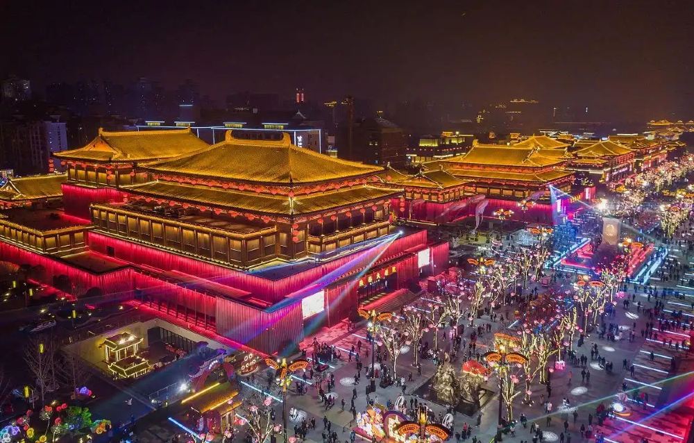 ▲ Datang Everbright City ตั้งอยู่ที่เชิงเจดีย์ห่านป่าในซีอาน เป็นย่านวัฒนธรรมและการค้าแบบจำลองสมัยราชวงศ์ถังที่กว้างใหญ่ไพศาล ซึ่งสร้างขึ้นเพื่อแสดงความยิ่งใหญ่ของยุคทองของจีน