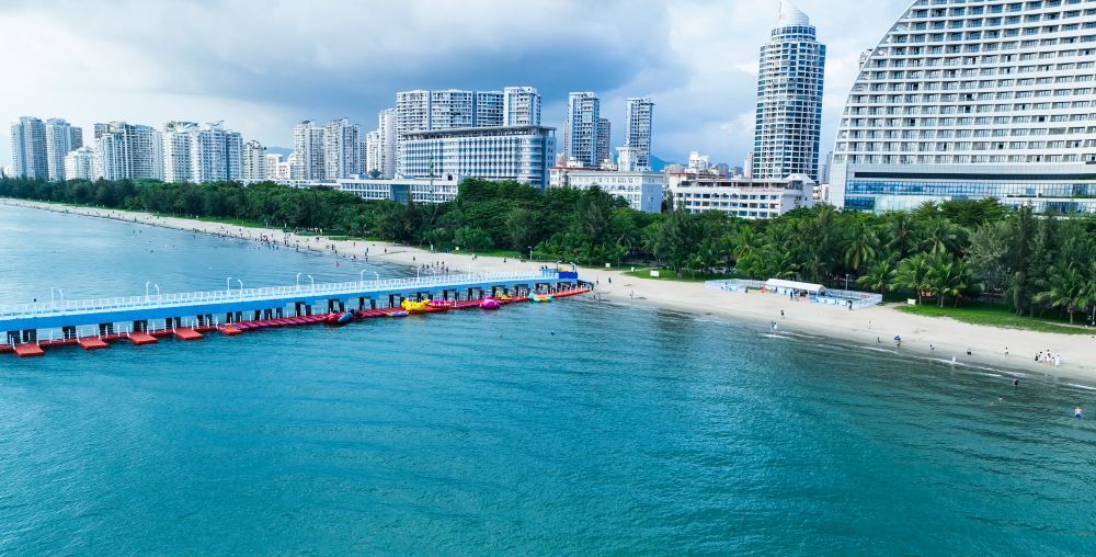 ทางเดินต้นมะพร้าวทอดยาวจากเขตพักผ่อนอ่าวซานย่าไปจนถึงตัวเมือง สามารถนั่งรถชมวิวไปตามเส้นทางได้