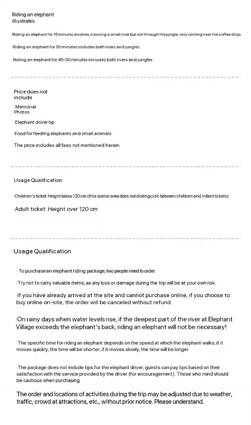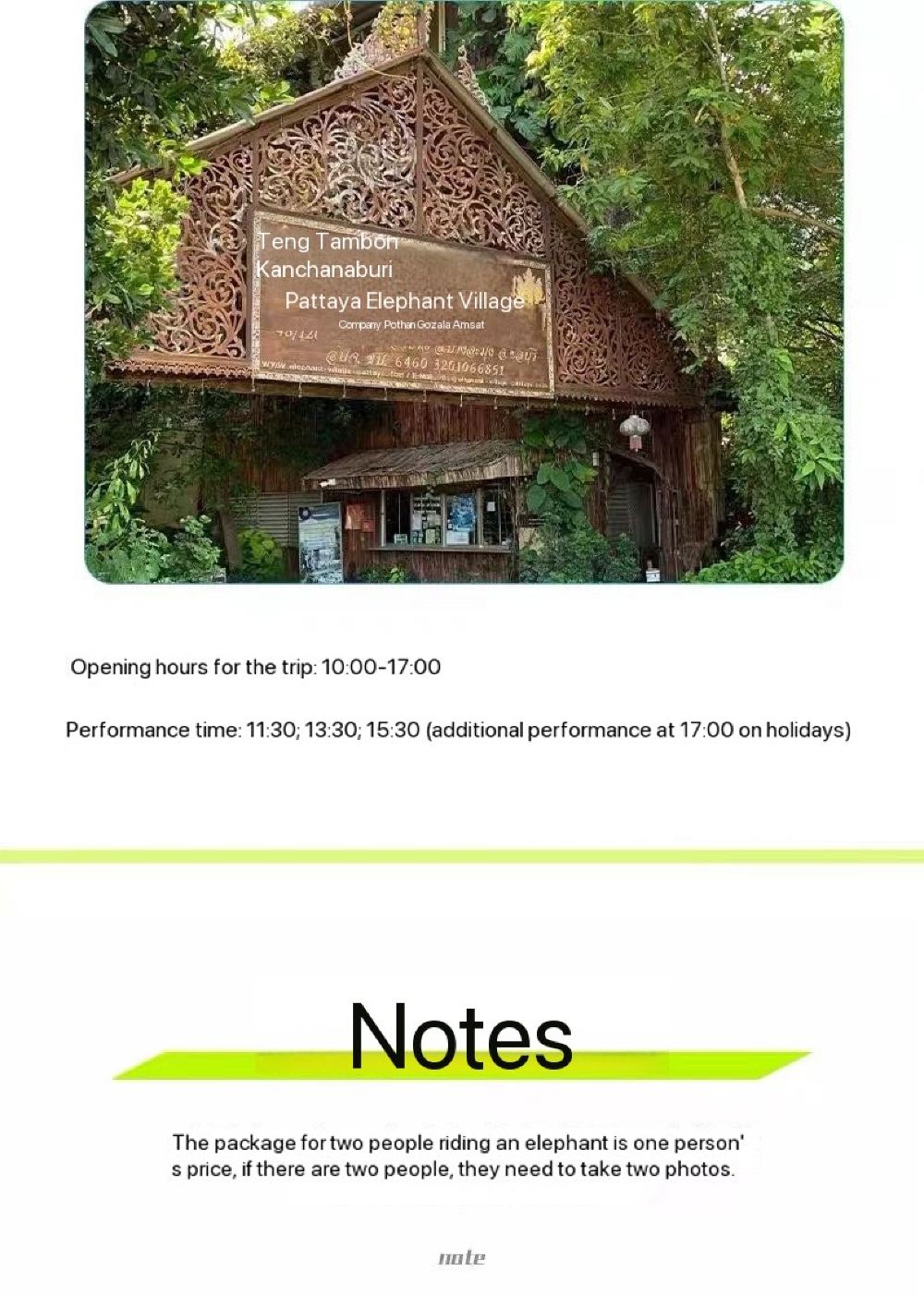 การจองตั๋วแบบรวดเร็ว | หมู่บ้านช้างยอดนิยม: ต้องจองตั๋วล่วงหน้า 2 ชั่วโมง เมื่อมาถึงสถานที่แล้ว คุณสามารถรอได้เพียง 2 ชั่วโมงก่อนใช้ตั๋วเท่านั้น ไม่มีการคืนเงิน