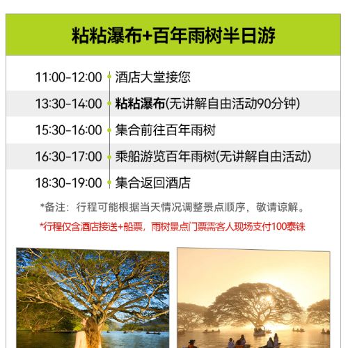 5. ทัวร์ต้นฝนร้อยปี + อุทยานแห่งชาติน้ำตกบัวตอง-น้ำพุเจ็ดสี รวมบริการรับส่งจากโรงแรม + ตั๋วเรือเท่านั้น ไม่รวมตั๋วเข้าชมสถานที่ต้นฝน ผู้เข้าชมต้องชำระค่าตั๋ว 100 บาท ณ จุดบริการ