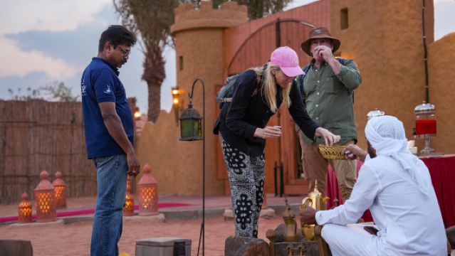 หยุดพักเพื่อเก็บภาพพระอาทิตย์ตกดินอันงดงามของทะเลทรายก่อนมุ่งหน้าไปยังแคมป์สไตล์เบดูอินดั้งเดิม เพลิดเพลินกับการต้อนรับอย่างอบอุ่นด้วยอินทผลัมและกาแฟอาหรับ ขี่อูฐแบบคนท้องถิ่น ลองเล่นแซนด์บอร์ดลงเนินทราย หรือตกแต่งมือด้วยลวดลายเฮนน่า
