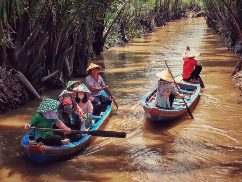 ล่องเรือผ่านลำคลองเล็กๆ ที่มีต้นมะพร้าว