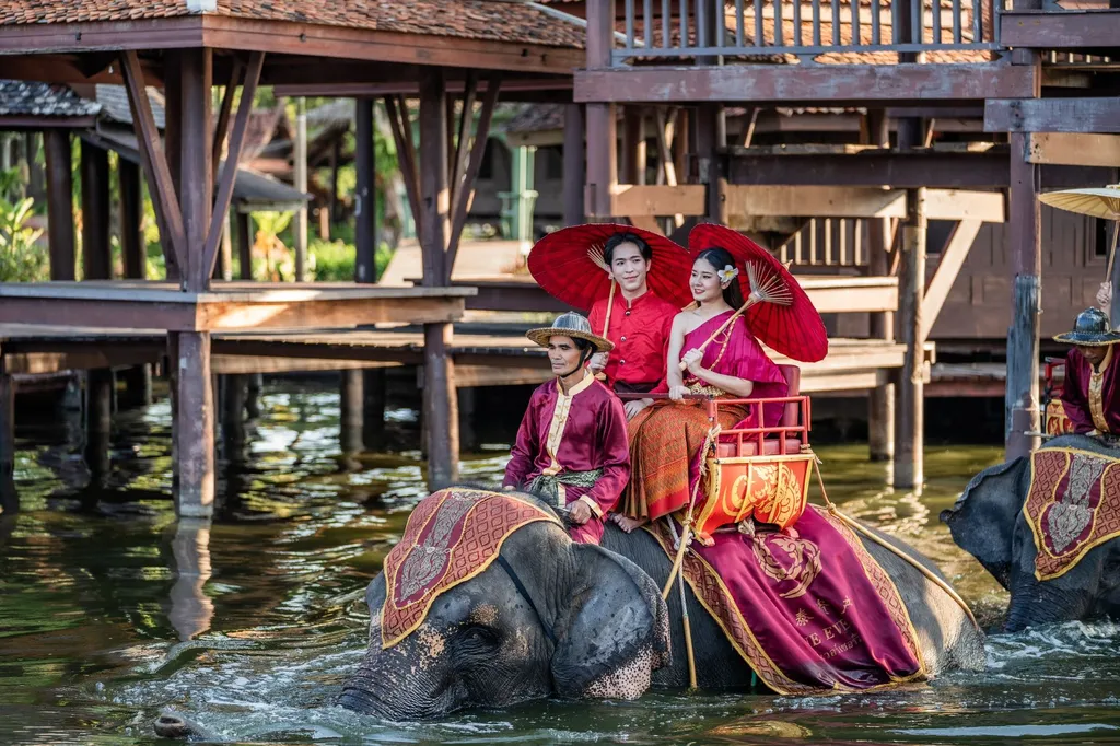 △ สวมชุดไทยแบบดั้งเดิม ขี่ช้างในน้ำ ดื่มด่ำไปกับประสบการณ์อันเป็นเอกลักษณ์ของไทย